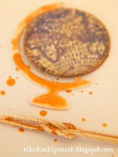Na spodnjo polovico sem zalepila bel krog, ki sem ga poškropila z zlatim Izink tušem, v to barvo sem namakala tudi ogrodje globusa ter vrvico, ki jo krasi dekorativni vozel. Prava moška voščilnica!