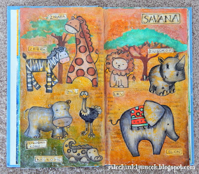 Na podlago sem najprej nanesla nekaj kosov na trake natrganih papirnatih robčkov, da sem deloma prekrila pisavo na podlagi. Ko sem vse skupaj premazala z gessom, sem se potrudila, da sem robčke čim bolj poravnala. Ozadje sem pobarvala s tušem v zlatorumeni barvi ter različnimi barvami Izink tušev. Živali sem pobarvala s Copic markerji ter jih prilepila na podlago. Zaradi naglice je barva podlage prišla na površje, kar pa sploh ni moteče. Če bi imela več časa, bi vsekakor pustila, da podlaga "prespi", preden bi pritrila živali. Drevesa sem izrezala s šablonami in pobarvala z vodenimi barvicami.