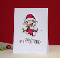 Nastala je preprosta enoplastna voščilnica. Motiv sem pobarvala s Copic markerji. Srce na trebuhu sem pobarvala z Wink of Stella, preden sem ga prekrila z Glossy Accents. Na oči sem dala samo Glossy Accents.