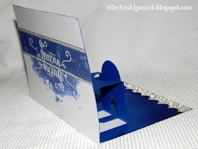 Ko je bil dvojni napis odtisnjen in pritrjen z belim reliefnim prahom, sem maskirala zgornjo in spodnjo stran papirja ter nezaščiteni del senčila s temno modrimi Distress Inki. Spodnji del sem ustvarila s "smooshing" tehniko. Iz srebrnega traku z bleščicami sem najprej izrezala dva tanka trakca, ki sem ju prilepila na zunanjost, preostanek sem z valovito šablono prerezala na dva dela ter ju prilepila v notranjost.