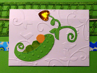 Pri prvi voščilnici sem na zeleno podlago nalepila kartonček kožne barve, ki sem ga predhodno pohroščkala s pikčastim reliefom. Nanj sem v zgornji del prilepila 3 zelene kristalčke. Osrednji motiv pa so 3 rožice pripete z razcepki. Podlaga rožic je iz blaga, zgornji del je iz papirja.