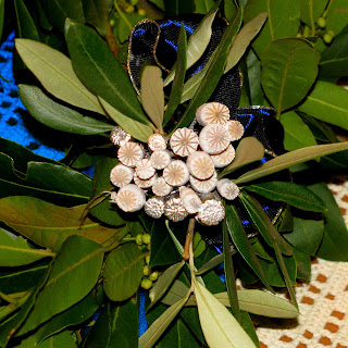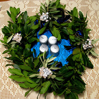 Sem ga pozabila fotografirati, zdaj se je oljčno listje že stisnilo in ni več tako lep. Zavrgla ga nisem le zato, ker ga bom uporabila kot osnovo za drug venček.