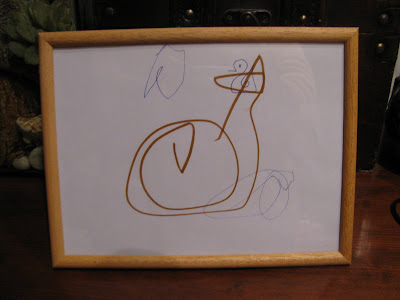 In tako tudi sam posnema risanje račke. Fazo čačk "gor-in-dol" je že dal skozi, zdaj dela že kroge. Ko pa je poskusil tudi sam narisati račko, je nastalo tole ... zanimivo je to, da mu je uspelo še večkrat!