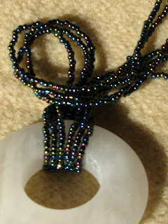 Niz metalnih perlic v mavričnih odtenkih (iz Frogwilla) sem preprosto zvezala skupaj, trikrat ovila okrog vratu in nataknila na obroček iz alabastra, ki sem ga kupila v Volterri za par evrov. Menim pa, da bi bil obroček iz žada veliko bolj primeren, saj je večina perlic z zelenim in modrim odsevom.