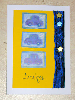 Pri drugi voščilnici je podlaga rumena, nanjo sem ob rob nalepila moder trak iz tekstila. skozenj sem speljala laks, na katerega sem nanizala 3 zvezdice: 2 zlati in eno modro. Zvezdice se lahko do polovice pomikajo gor in dol. Osrednji motiv so trije modri avtomobilčki, kot se za pravega avto-poznavalca spodobi.