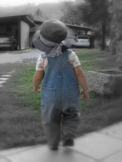 Malo sem pospravljala Kljunčkove fotografije in ti dve sta se mi zdeli primerni, da jih objavim tukaj. Prva bi mi bila bolj všeč, če avtomobilov ne bi bilo doma, saj kvarijo celotno fotografijo s stezico, kamnitim koritom in Kljunčkom na sredi. Mulc si je pač takrat omislil vtakniti klobuk na glavo, da ga je mama lahko pofotkala. Tako pač je.