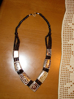 Nameravala sem narediti kvačkanko, vendar so bile za začetek 2 mm majhne perlice (neekakomerne) pretrd oreh in črn sukanec mi vsekakor ni bil v pomoč. Ugotovila sem tudi, da bi bila takšna ogrlica pretanka, da bi naredila željeni efekt, zato sem se znašla drugače.