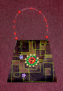 Sledilo je še zunanje krašenje ... gumbki in perlice. Zadnja gumba držita ročaj, sprednji pa je le okrasni. Za zapiranje sem nalepila košček folije za zavijanje zvezkov ter kos obojestranskega lepilnega traka, da se vrečko lahko večkrat uporabi.