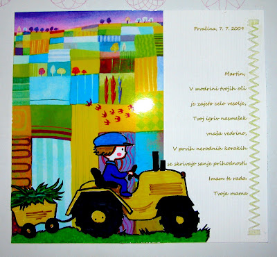 Hotela sem narediti novo fotografijo v boljših pogojih, a je bila voščilnica Kljunčku tako všeč, da jo ima ves čas po rokah, sploh traktor je zakon. Vsem po vrsti kaže, kje je traktor, kje fantek, ptički, drevesa, voz ... posledično pa voščilnica (beli del) ni več v najboljšem stanju. Za v album bom očitno morala narediti novo! V veselje pa mi je, ko vidim, kako se Kljunčku spremeni obrazek, ko zagleda voščilnico. Zasmeje se, malo potrese z glavico in že z roko potuje k njej.Všeč mi je, kako se podoba jate ptic ujema s traktoristom. Tik nad njegovo glavo so.