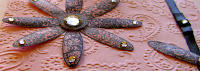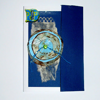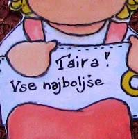 Posrebren rob ni bil načrtovan, a je Kljunček dodal še nekaj svojega umetniškega talenta, ko sem se obrnila stran. Na razcepek sem dala malo "Liquid Pearls" in pustila, da se posuši. Očitno nisem dala dovolj daleč, kajti "hops" in rokice so bile vse biserne. Potem sem ta efekt še malo potencirala, da bi malo prikrila packe, ki so nastale. Po rožici je ta efekt izpadel krasno ... je celo lepša kot prej. Rob modrega papirja pa bi bil lepši brez bisernega efekta.