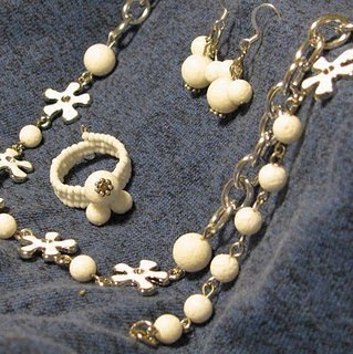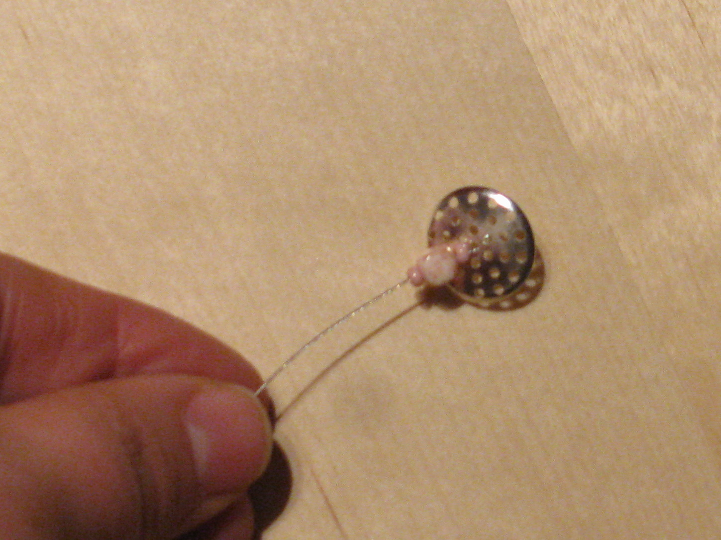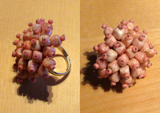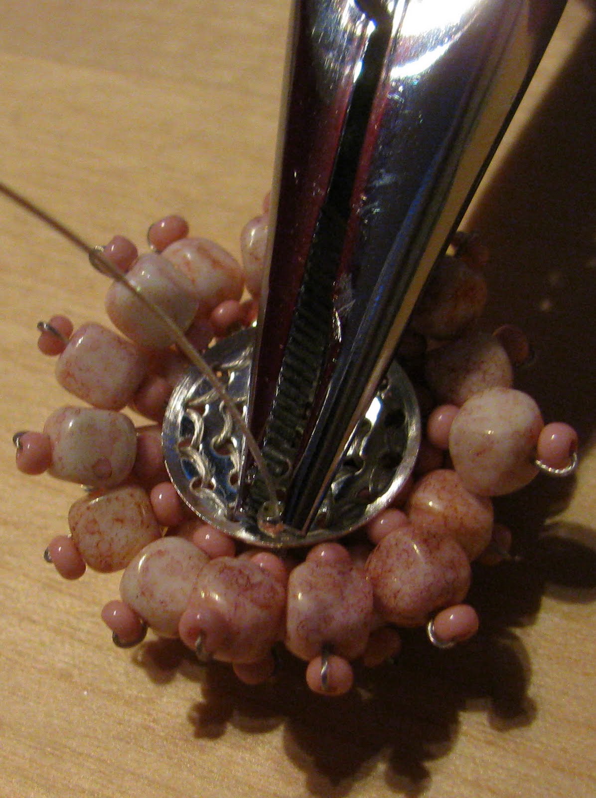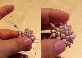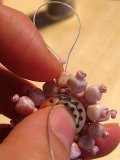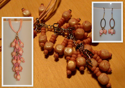 Potem pa sem iz plastičnih perl izdelala okraske ... z rezultatom nisem najbolj zadovoljna, vendar tudi časa nisem imela veliko ... najbrž bom še kaj spreminjala. Izdelala sem zelene listke in rožnate venčke. Če bom imela čas, bom venčke zamenjala z metuljčki. Dokler rožice še ne cvetijo sem na vrh postavila še dva listka z rožico. To bom ob cvetenju odstranila.