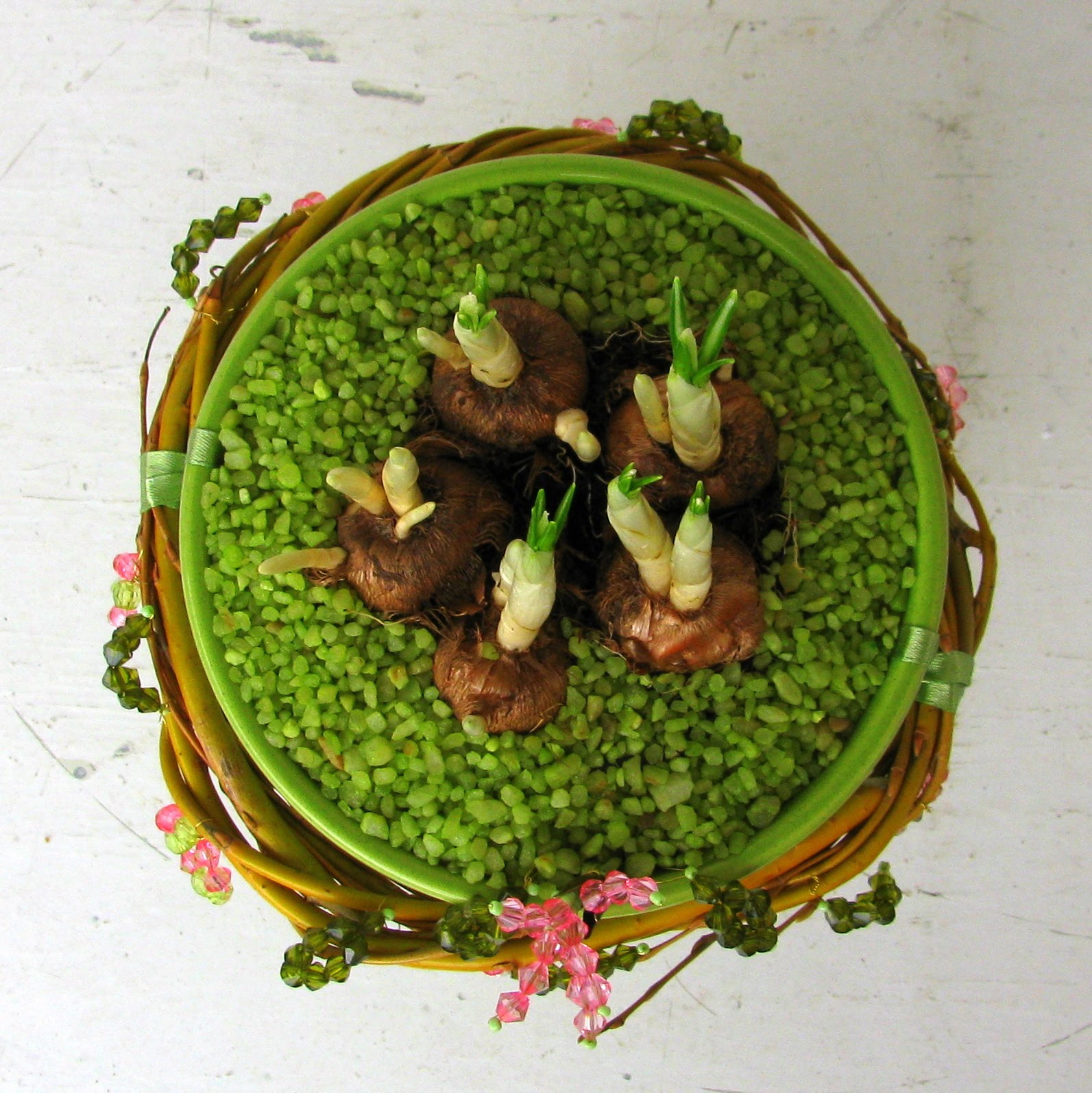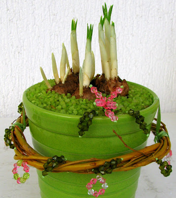 Pa se vrnimo k današnji temi: da bi si pričarala pomlad v kuhinji, sem kupila bele krokuse, vsaj upam, da so beli, saj še ne cvetijo. Postavila sem jih v zelen lonček za orhideje - no, ni bilo tako preprosto. Lonček za orhideje je zelo globok, zato sem na dno nasula, kar sem imela trenutno pri roki - luščine arašidov, nanje sem postavila krožniček (ki sem ga izdelala iz ene plastične posodice, saj so bili podstavki za rože vsi po vrsti preširoki). Nato sem naredila lončku "krilce", tj. obroč iz kartona, da mi ni bilo potrebno napolniti celega lončka s peskom. Nasula sem pesek. Tistega iz adventnega venčka ...