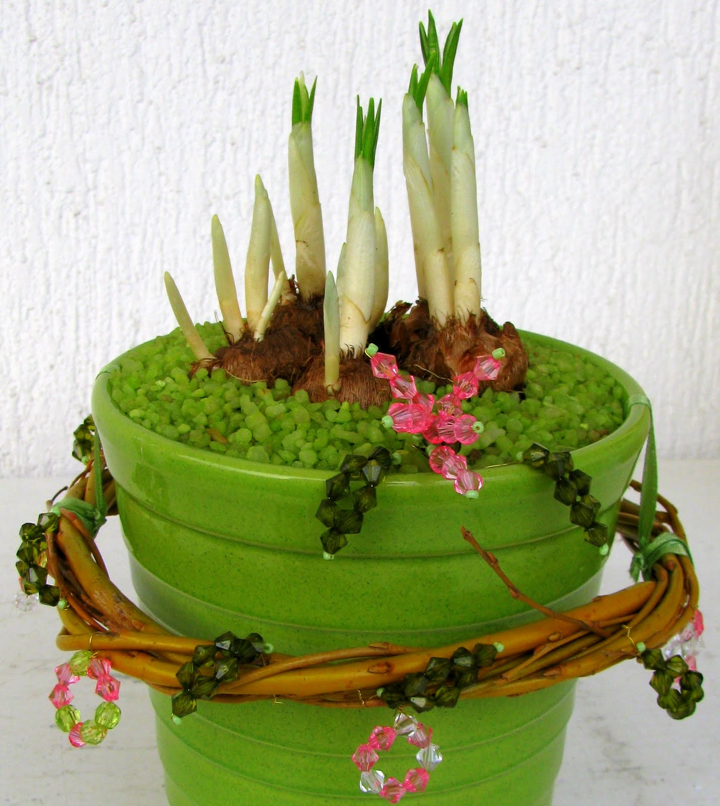 Potem sem ubrala dve vrbovi veji in ju spletla v venček. Venček sem na dveh koncih privezala z zelenim trakom, da visi izpod roba posode. Trak je v enem kosu, samo zataknjen je pod lonček z rožami.