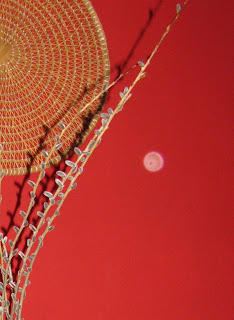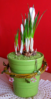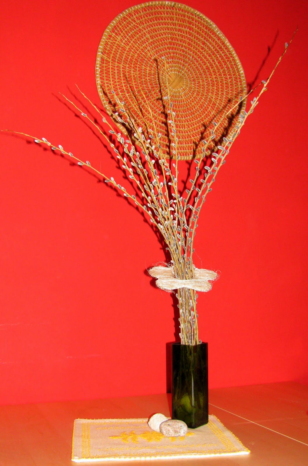 Objavo zaključujem s spomladansko kompozicijo, ki sva jo prpravila s Kljunčkom. Na sprehodu ob reki Vipavi sva nabrala šopek mačic, ki sem jih vtaknila v vazo (narejeno iz steklenice za oljčno olje) ter privezala z neko staro dekoracijo v obliki rože, ki jo prekladam po omarah že nekaj let. Stare kamenčke iz morja sem porabila, da sem vazo utrdila, kar mi jih je ostalo (2), pa sem pustila kar na mizi pred vazo. Ta teden si to lahko privoščim. Na mizi je ročno tkan prtiček, ki sem ga pred leti kupila na Sardiniji.