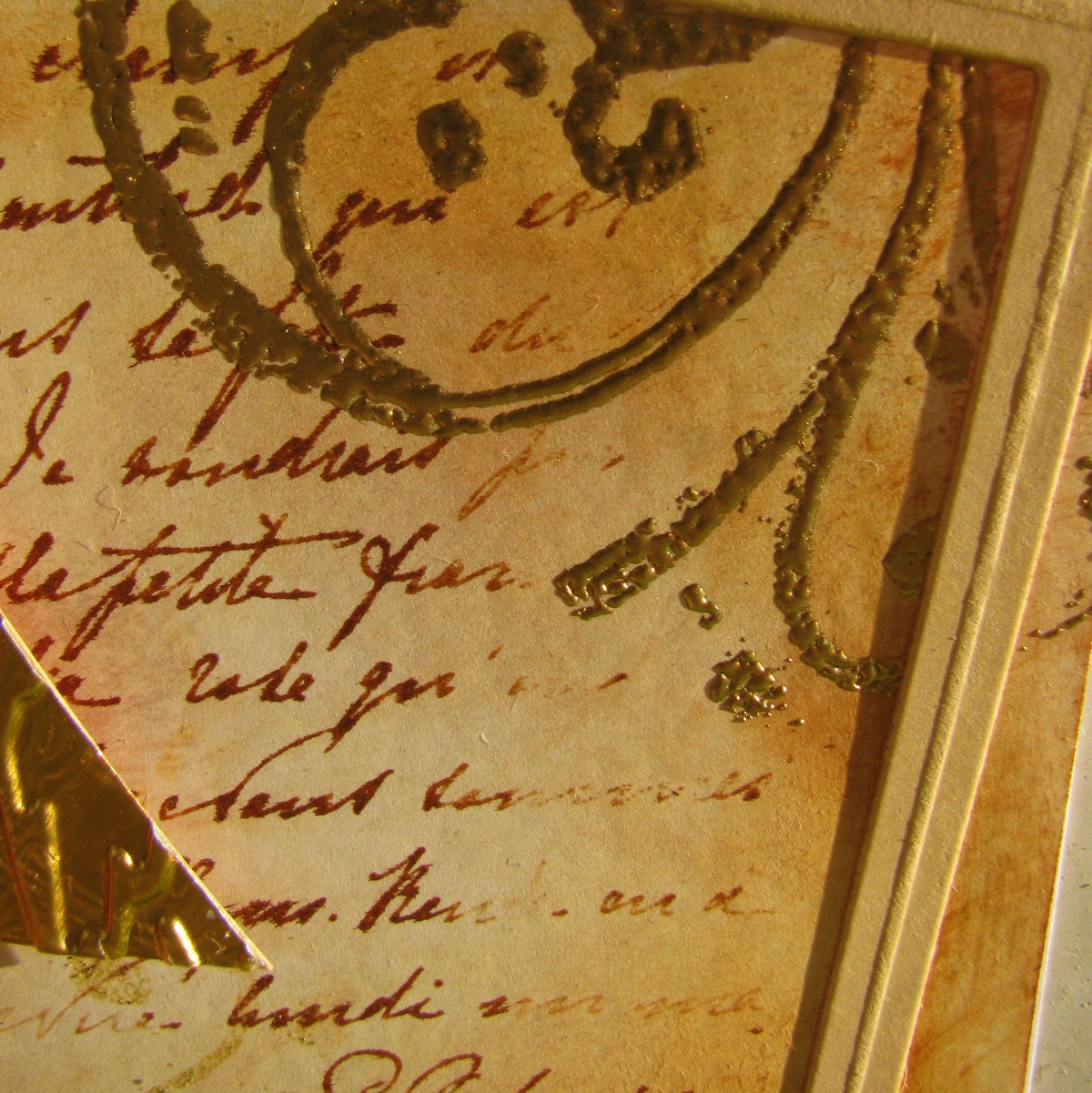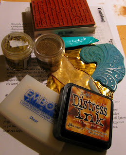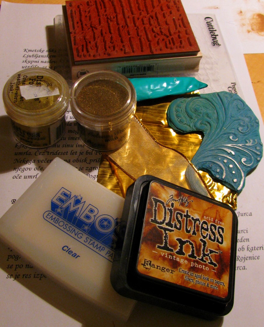 Emboss (Clear); Distress Ink (Vintage Photo); Ranger embossing powder (Gold; Copper)