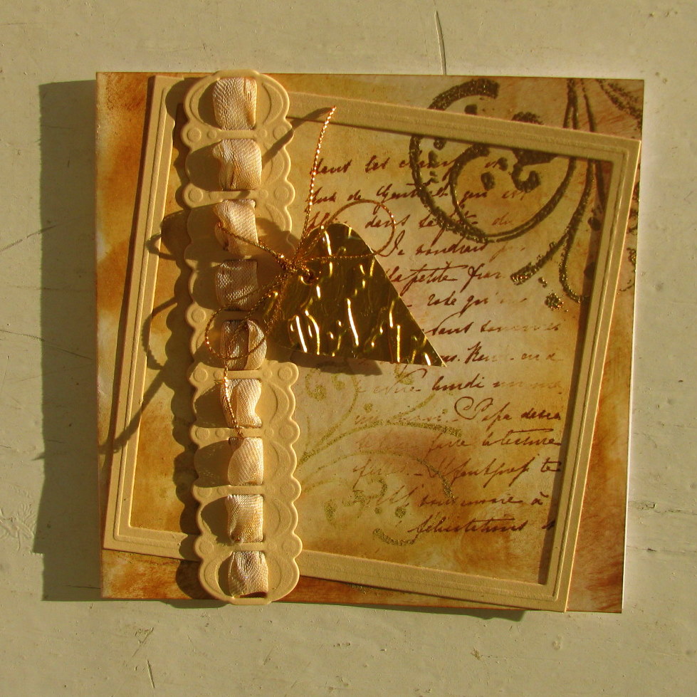 Cuttlebug; Cuttlebug embossing folder (Script); Spellbinders (Squares XXL); Marianne Design (Ribbon border)