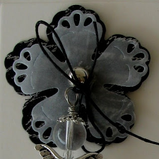 Dodala sem ji še drugo meni zelo ljubo štampiljko, ki sem jo sama izdelala iz adigrafa. Medtem ko sem prvo odtisnila z vintage rjavo barvo, sem spirali embosirala - spodnjo s peščeno, zgornjo z zlato.