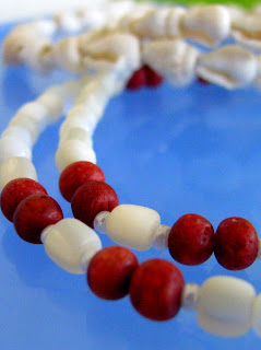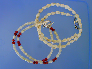 Tole sta v bistvu le predelani stari ogrlici. Mislim, da je bila tista s polžki kupljena na Malem Lošinju, tista s koralami pa na Korziki. Obe sem veliko nosila, zato so bili zaključki kar dotrajani, motilo pa me je predvsem to, da se je nekaj polžkov in nekaj perlic iz biserovine zdrobilo, tako da je bil del vrvice odkrit.