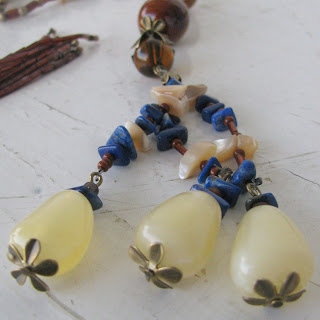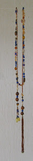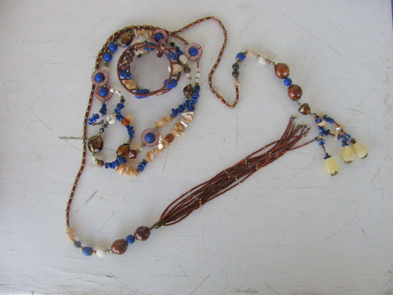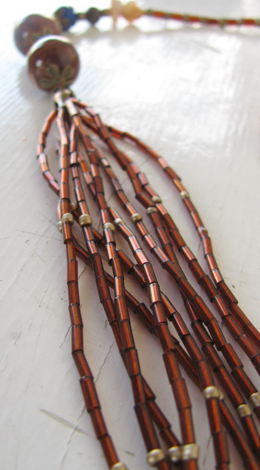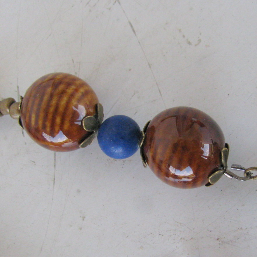 Za izdelavo tako dolge ogrlice (mislim, da meri vsaj 2 m), sem uporabila najrazličnejše materiale, osnovni toni pa so rjavi in modra. Za modro sem uporabila čips, ki sem ga reciklirala iz ene stare mamine ogrlice ter cenimetrske kroglice iz lapis lazulija. Za rjave tone sem uporabila najrazličnejše materiale: keramične kroglice, kamne, čips školjke in preluknjane krogce iz biserovine ter nekaj lesenih primerkov. Največ pa sem porabila drobnih perlic: rjavih, zlatih in paličic.