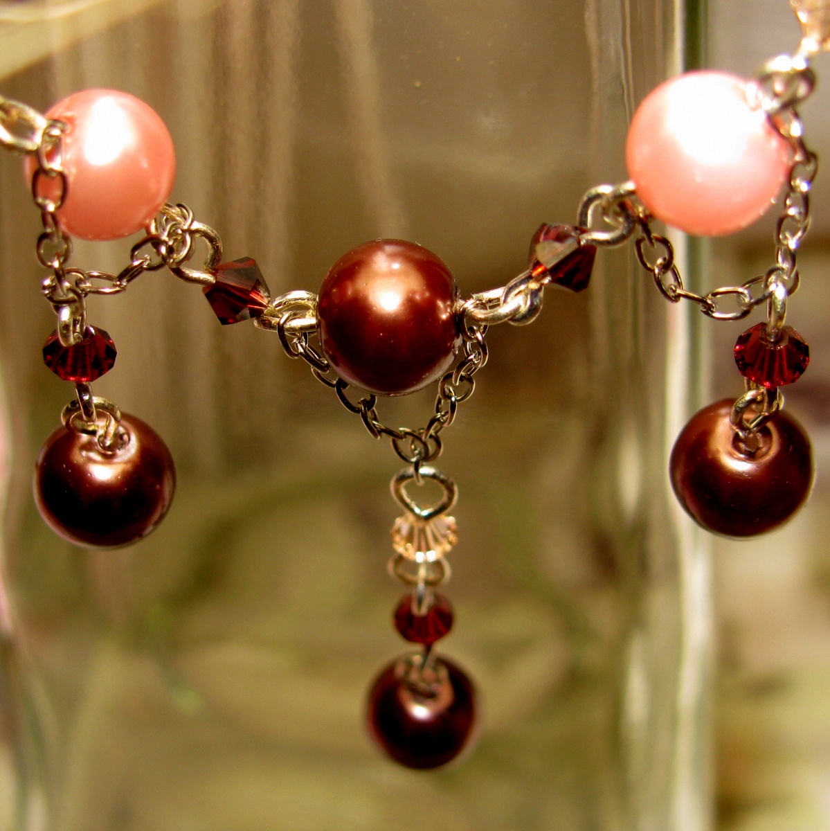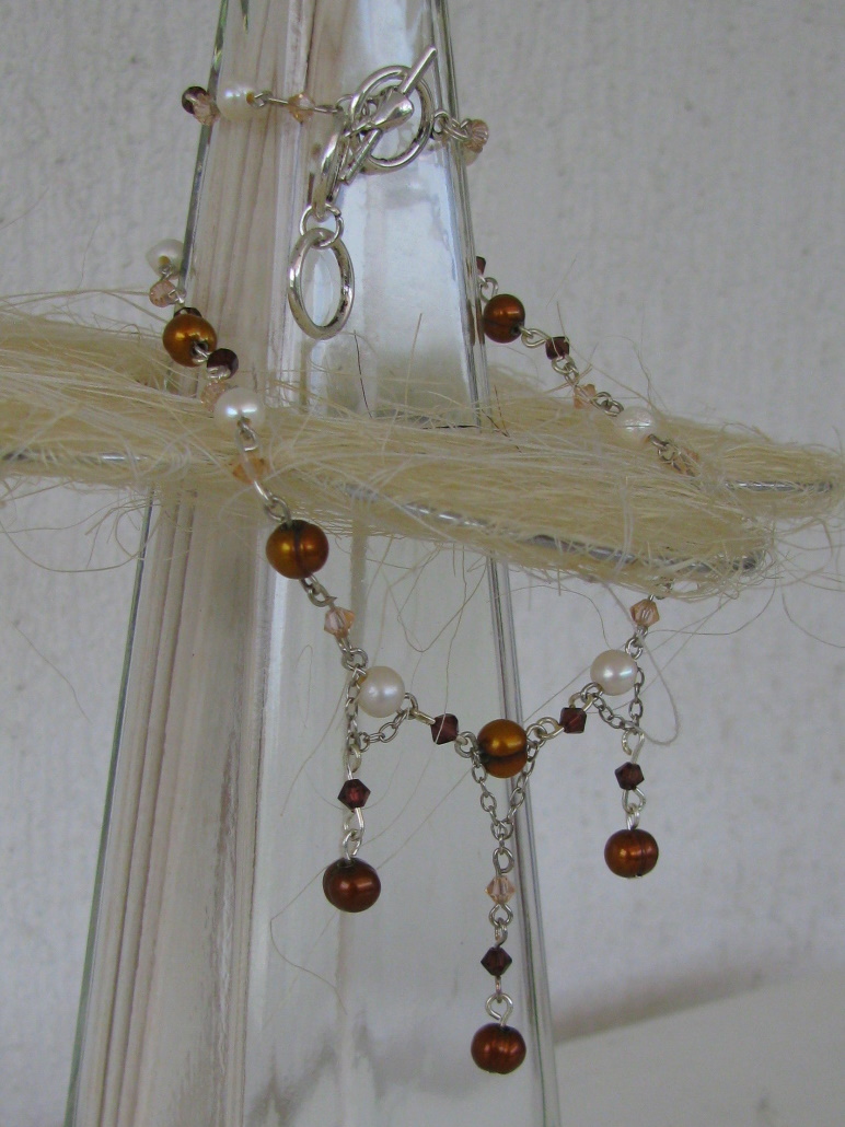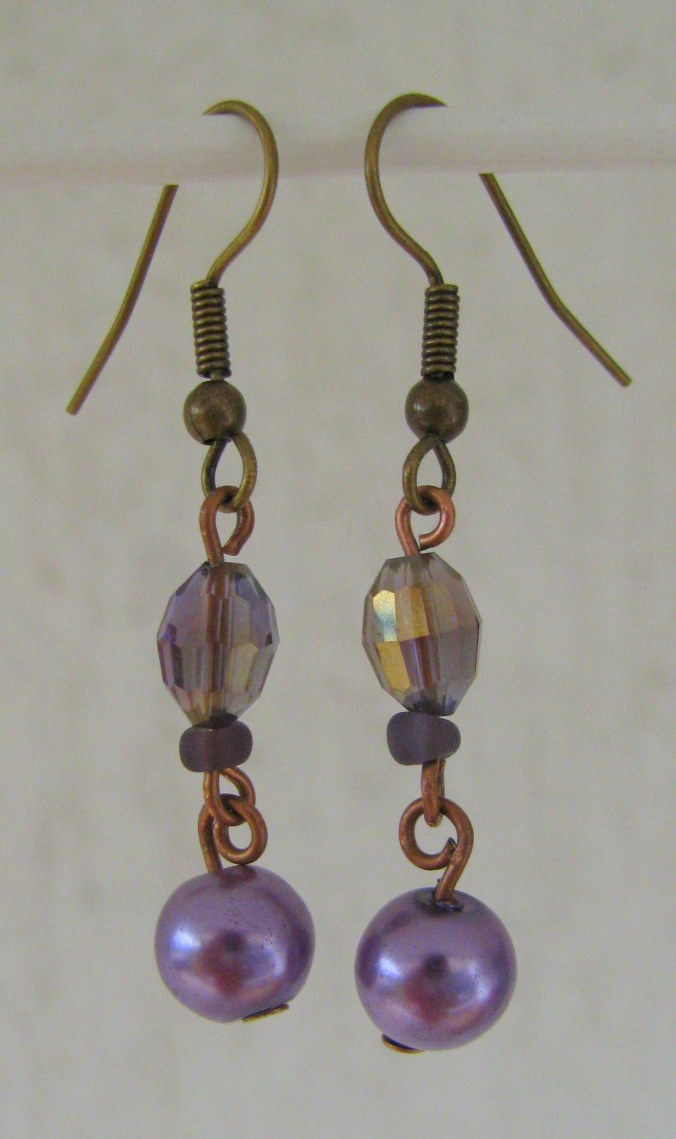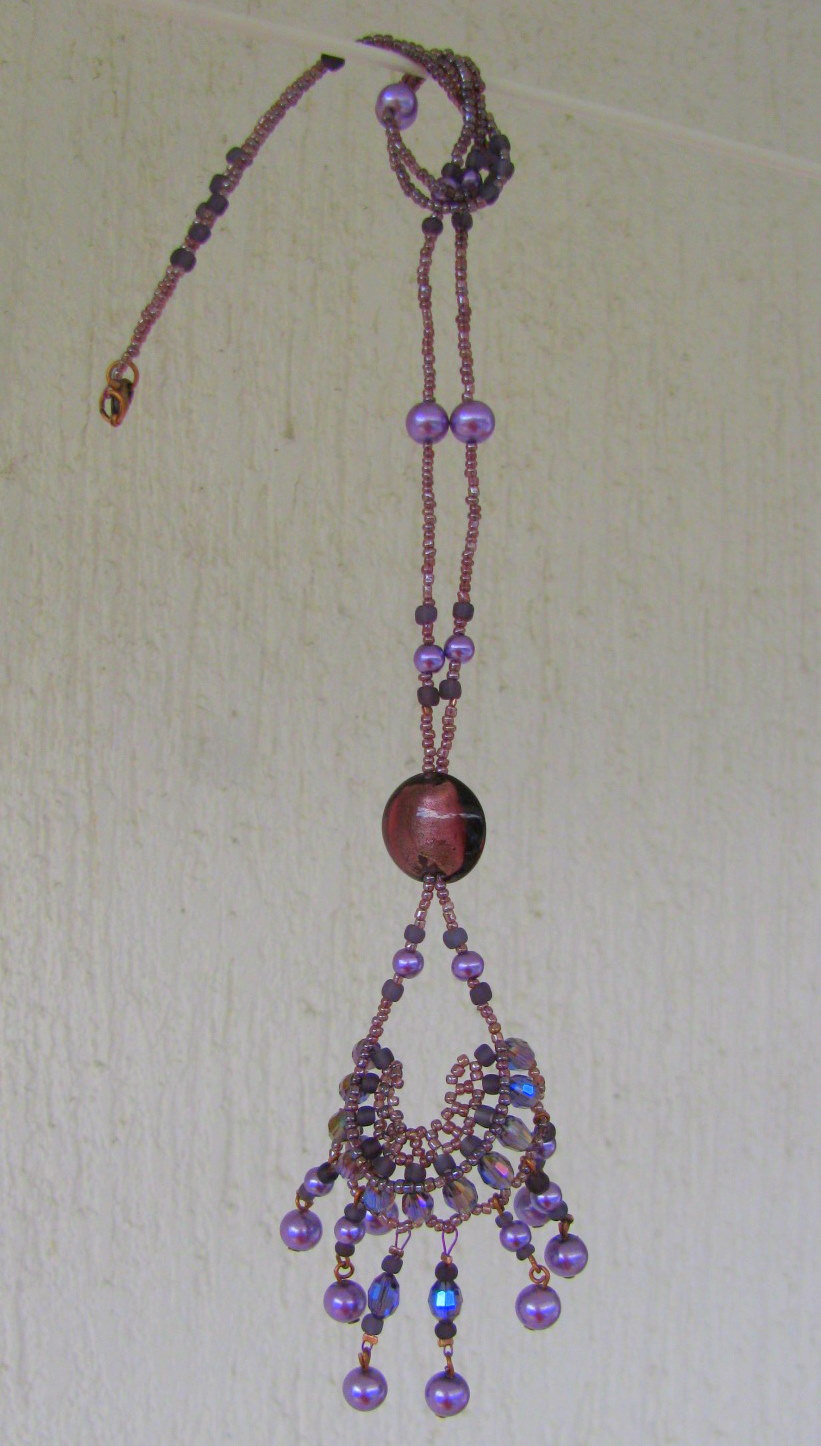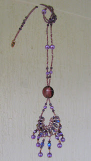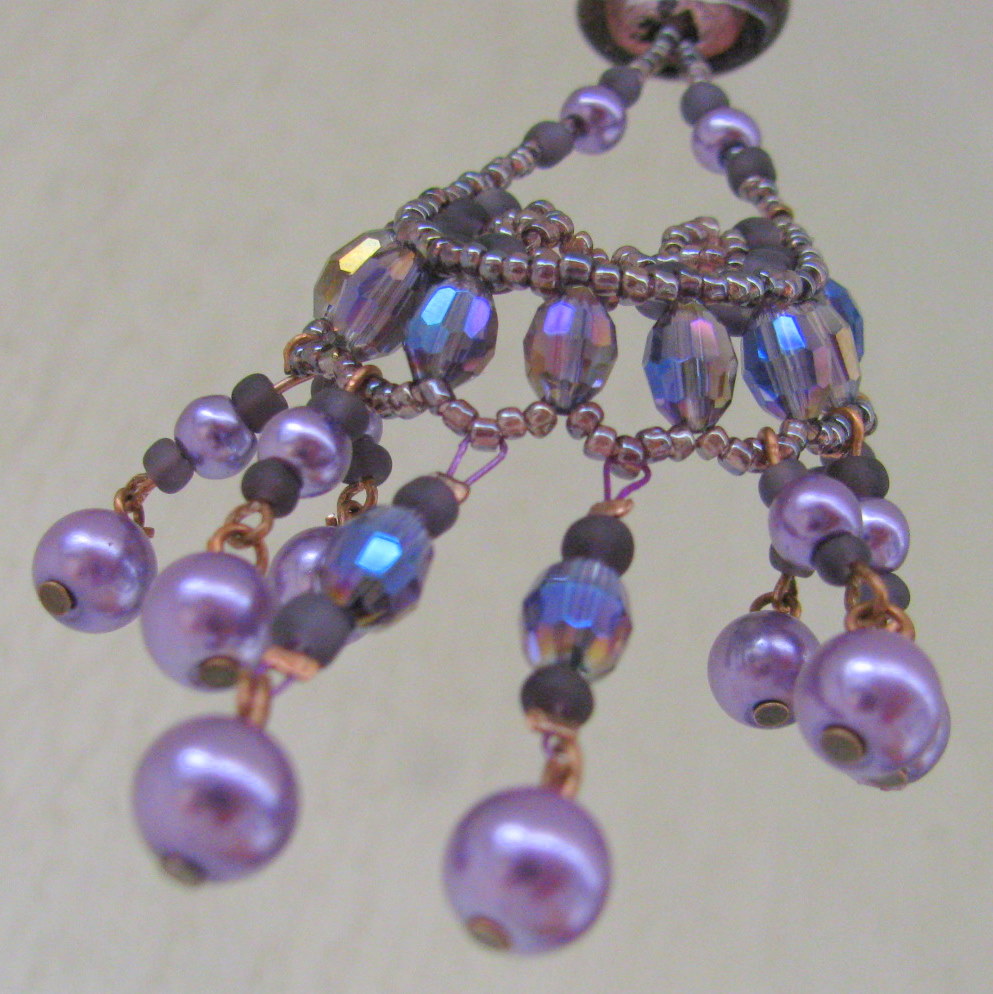 Vijolično sem izbrala, ker je bila edina barva, v kateri sem imela vsaj približno enako velike perlice. Uporabila sem kristalčke, steklene perle in navadne perlice. Zaključke sem uporabila v bakreni barvi.
