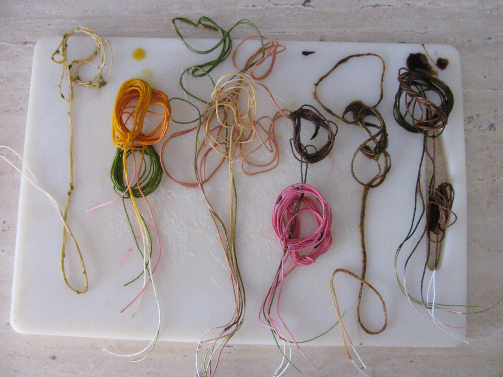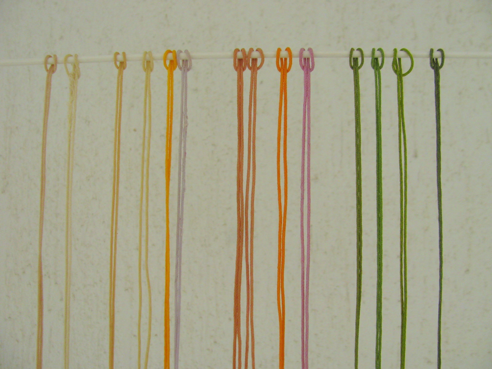 Za konec še že posušene vrvice zavezane z nepobarvanimi vrvicami (vodoravno so pobarvane vrvice, navpično pa kot pred barvanjem).