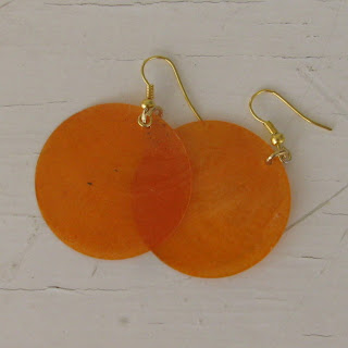 Te diske iz biserovine imam zelo dolgo. Iz njih sem izdelala nakit sestrični, nad katerim je bila navdušena, saj je tudi ona iskala nekaj v oranžni, a ni našla ničesar. Tale izvedba je še bolj preprosta: samo oranžen krogec in nastavek za uhane.