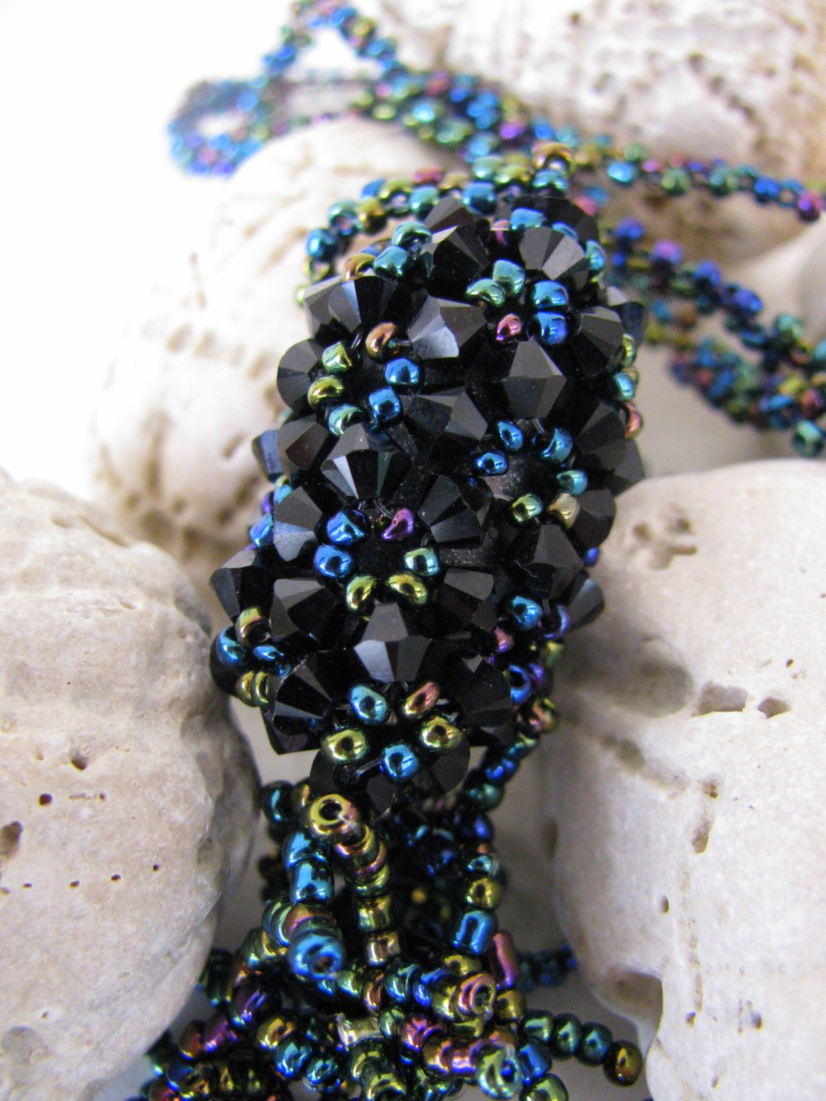 Ovalen okrasek je izdelan iz 4-milimetrskih črnih Swarovski kristalčkov in 2-milimetrskih navadnih steklenih perlic. Obesek sem zaključila s prepletanjem v obliki koral, v katere sem vpletla tudi nekaj steklenih črnih zvezdic.