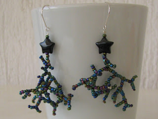 Uhane sem izdelala podobno kot zaključek obeska: črna zvezdica, iz katere korale raztezajo svoje veje. Čeprav sem pazila, da sem oba uhana izdelala po istem načrtu, se razlikujeta, saj je velikost perlic malo različna, oblika pa je odvisna tudi od tega, kako se nit zasuka. Zanimiv efekt. Oba uhana sta enako velika, a ne popolnoma enaka.