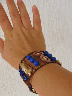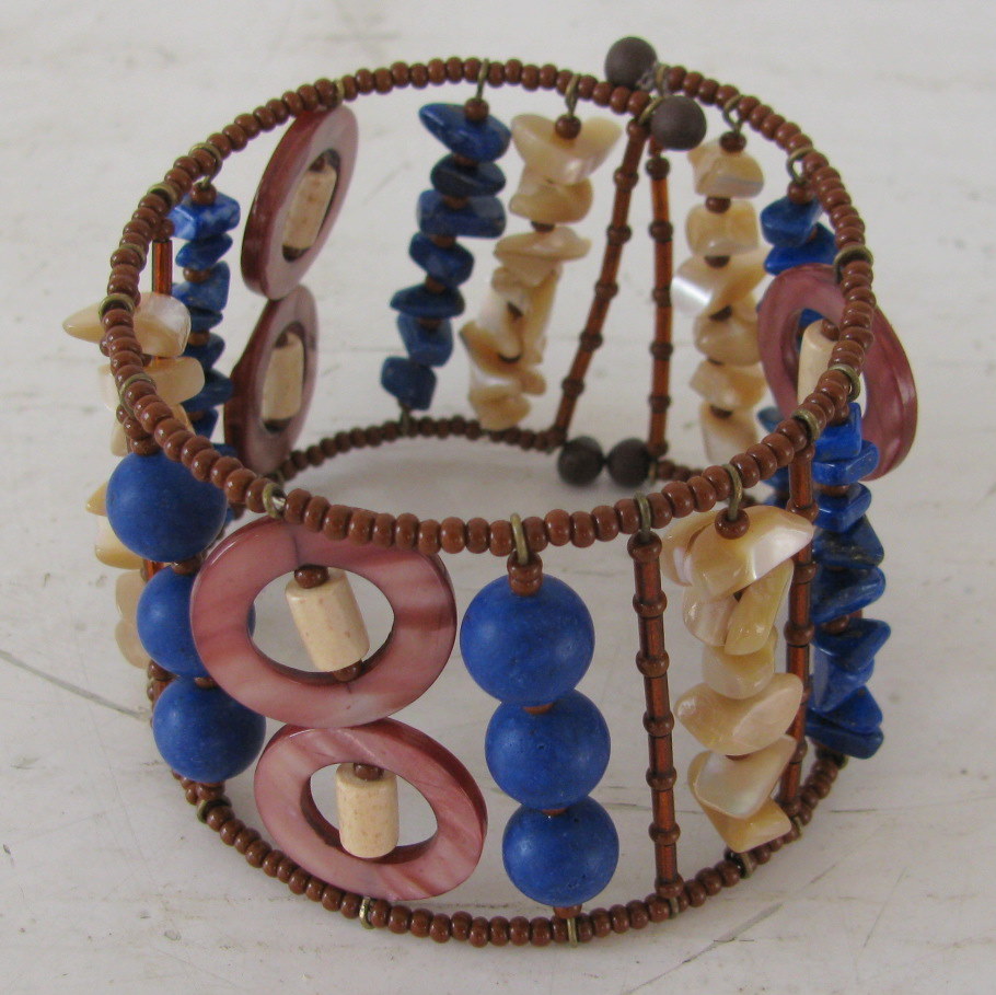 Ogrodje zapestnice predstavljata dve vzporedni spominski žici ter žebljički z ušesom kot distančniki. Seveda sem vse skupaj oblekla v paleto različnih barv in materialov: lapis lazuli, biserovino, les, školjke ...