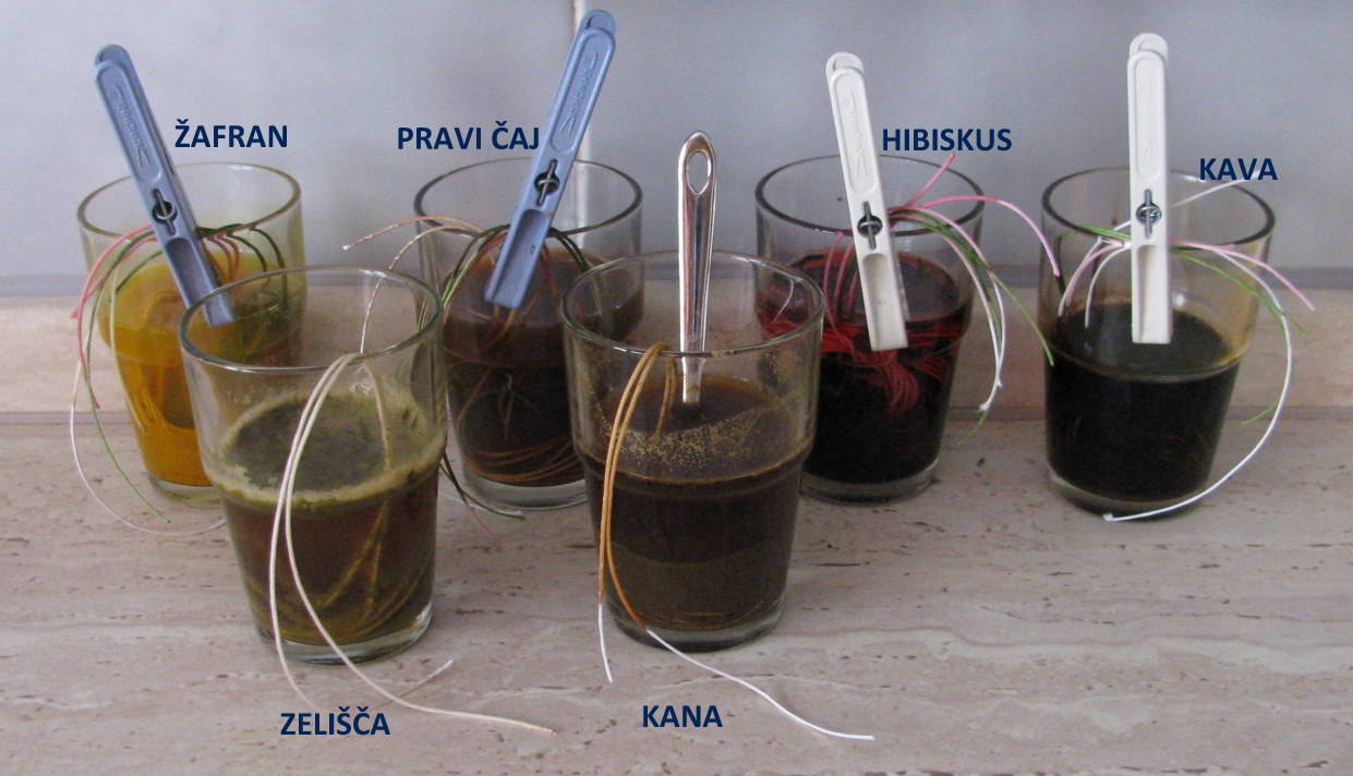1. KORAK: Prebrskala sem vse predale in police z živili, da bi našla sestavine, ki bi lahko obarvale tekstil. Malo sem se spomnila na barvanje pirhov, a čebule nisem uporabila ... Nato sem te sestavine dobro premešala z vročo vodo ter vanje položila po tri vrvice: belo, svetlo rožnato in zeleno. Namočila sem jih v pisane kozarčke in jih pustila namakati nekaj ur.