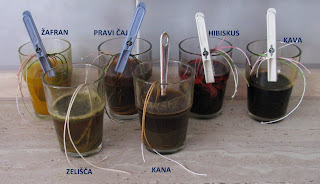 Kuhinja se je spremenila v malo kemijsko delavnico. Tu se je mešalo, dolivalo, spet mešalo, pogrevalo ... Material sem pobrala kar v bližnjih omaricah. Za barvanje sem uporabila kar živila, predvsem začimbe.