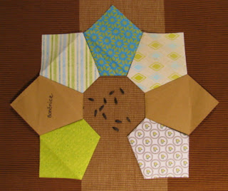 Osnova ovojnice je kvadrat, ki ga prepognemo po diagonali v trikotnik, nato vogala na pregibu zavihamo navzgor (stranica naj bo vzporedna z dnom vrečke), nazadnje še enega od zgornjih vogalov zataknemo v zgib, napolnimo z želeno vsebino ter še drugi vogal zataknemo kamor prvega ... sem bila jasna? Vse se zelo dobro drži skupaj brez kančka lepila. Uporabila sem doma natisnjen 80-gramski papir, lahko bi tudi časopisnega. Vrečki za semena sta izdelani iz raztrgane eko vrečke.