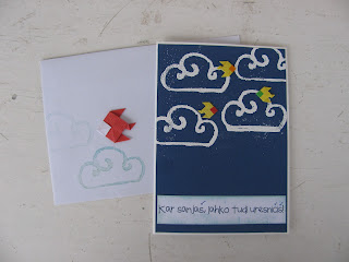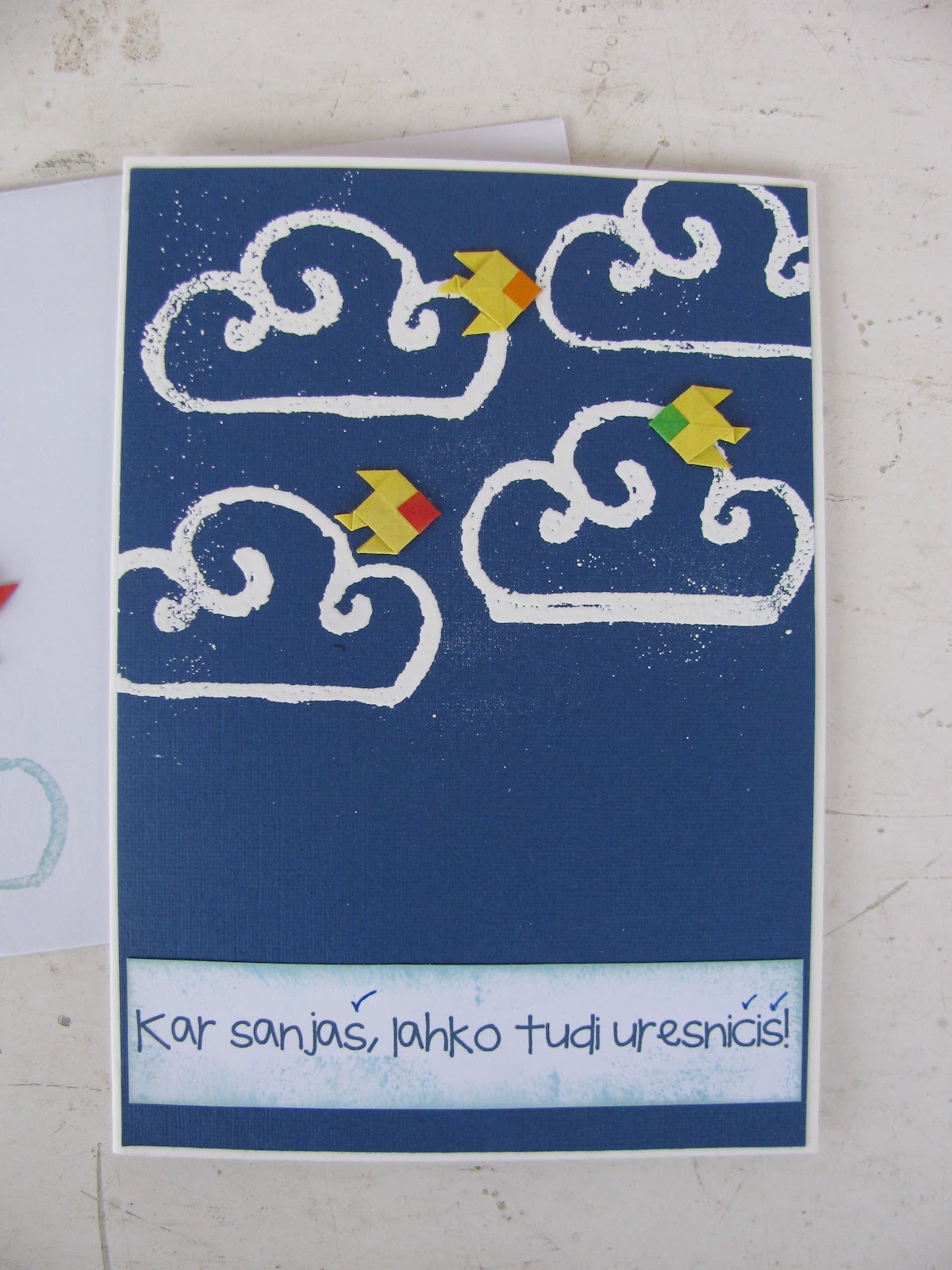 Iz drobnih koškov papirja sem izdelala "micene-micene" origami ribice, ki sem jih nalepila na ozadje z embosiranimi oblački. Štampiljko za oblake sem sama izrezljala iz adigrafa. Medtem ko neodstranjeni ostanki prahu za embosiranje na originalu niso bili moteči,so na fotografiji izpadli kot nekakšne packe.