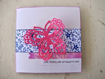 Iz poplave voščilnic sem s težavo izluščila eno, zato sem izbrala dve, ki si delita 5. mesto. Prva je preprosta vošičilnica, izbrala sem jo tudi zato, ker sem ves papir izdelala sama, le metulja sem izrezala s pomočjo hroščka.