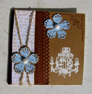 Ta voščilnica pa je zelo bogato okrašena. Všeč sta mi predvsem rožici v svetlo modri barvi, ki ustvarjata zelo nevsiljiv in skladen kontrast s podlago v kremno-rjavih tonih.