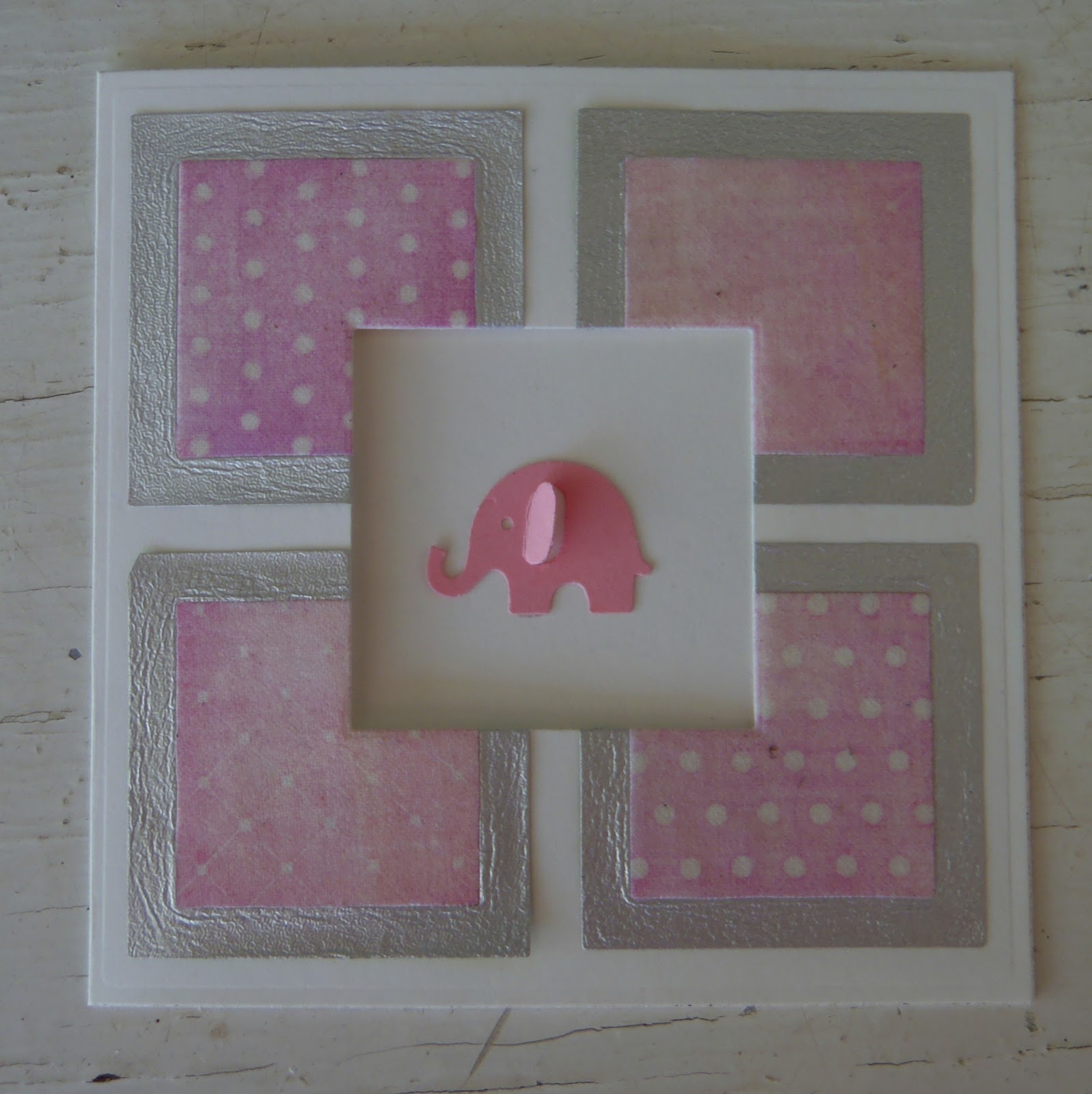Cuttlebug; Martha Steward štanca (Embossed Elephant); Nellie Snellen (Squares 3); QuicKutz (Square frames);
