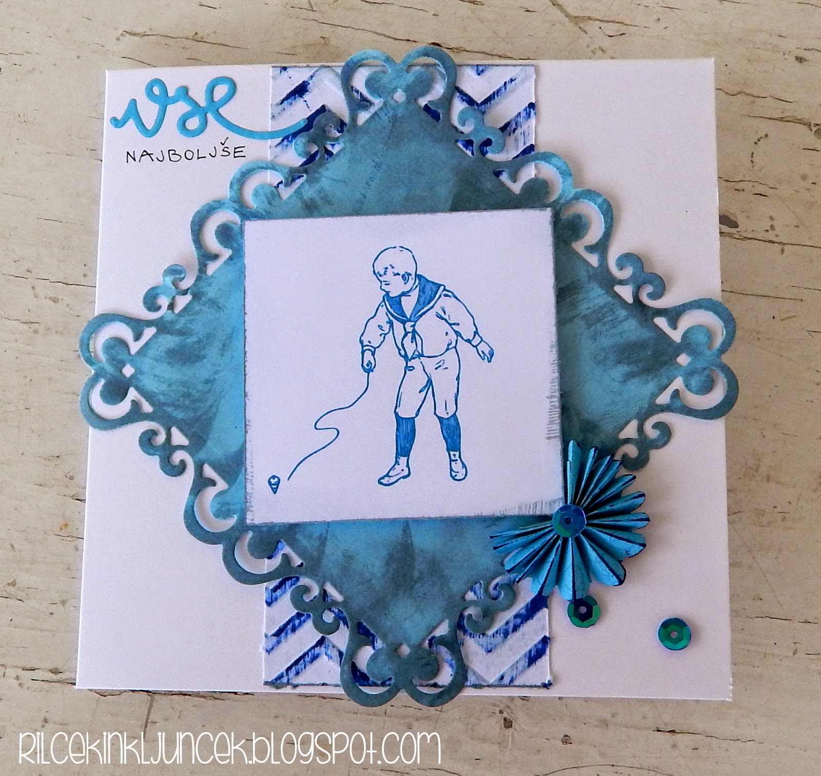 Voščilnico sem izdelala za izziv Sentimental Sundays, zato sem morala uporabiti vsaj košček tekstila. Jaz sem iz tekstila izdelala osrednji element - rožo. Tokrat sem prvič uporabila Tinine rezalne šablone, ki sem jih naročila pred dnevi. Zelo so mi všeč tako kot vse Tinine stvaritve.