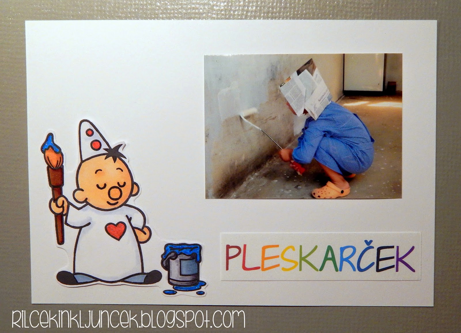 Vse se je začelo z odsluženo škatlo čokoladnih bonbonov. Preoblekla sem jo v sivo lepenko in oblikovala posamezne dele. Notranjost sem zapolnila s koščkom stiropora. Kljunček je izbral zeleno barvo in notranjost prebarval. Zelo nestrpno je čakal, da se barva posuši. Medtem sva izdelala ostale dele: miško, nalepke in tipkovnico. Sam je izbral izdelavo tipkovnice: z okroglo štanco je izdelal krogce, jih zalepil na bel papir ter napisal črke in ostalo besedilo. Najbrž zaradi eksotičnosti je izbral vse črke, ki so na računalniku in jih slovenska abeceda nima.