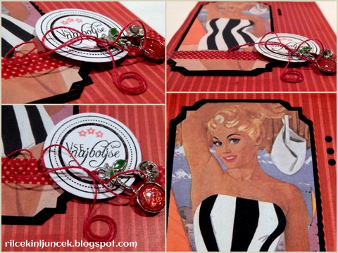 Želela sem izdelati izrazito ženstveno voščilnico, zato sem pobrskala v mapo s slikovnim gradivom in našla to mično gospodično v črtastih kopalkah. Izbrala sem jo prav zaradi črno-belih kopalk. Malo sem jo obrezala, saj je bilo okrog nje preveč plaže, vogale sem izdelala s štanco. Prav tako sem obdelala kos valovite lepenke, ki sem ga prebarvala v črno.