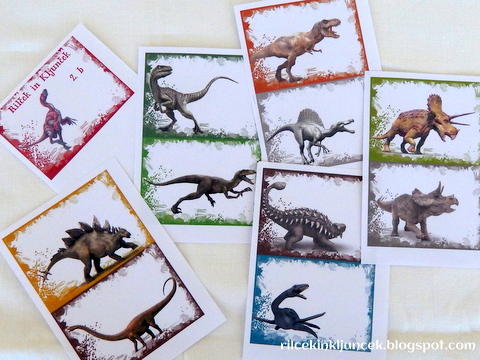 Moj mladič je že v drugem razredu in letos si je za temo nalepk izbral dinozavre ... tako sem izdelala serijo nalepk, ki sem jih natisnila na samolepilni foto papir. Nato sem jih izrezala in še malo senčila z distress inki. Čisto malo na robovih ... sem pač perfekcionistka.
