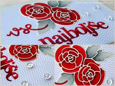V bistvu je bila sama izdelava zelo preprosta: Najprej sem izrezala črno podlago v velikosti voščilnice, nato je prišel na vrsto moj Cuttlebug ... s šablono Lawn Fawn sem izrezala rdeč pravokotnik, ki sem ga posredi razpolovila; nato sem s Spellbinders šablonami izrezala kroge, da sem dobila pike. Pike sem naluknjala naključno ... v naravi ni simetrije. Na podlago sem rdeč karton zalepila z debelejšim 3D trakom. Tik pred lepljenjem sem z reliefnim prahom dodala še napis, voščilo.