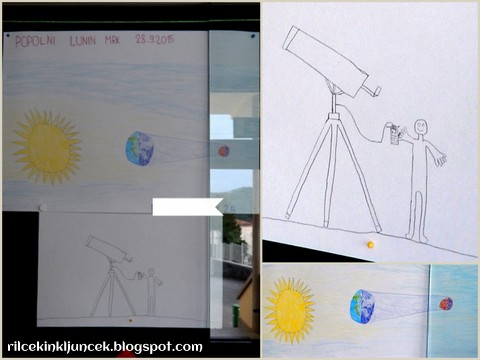 Poleg dinozavrov je Kljunčkova strast tudi vesolje, zato ga je nona peljala na organiziran ogled luninega mrka. Ni mu bilo težko iti zgodaj spat, še manj pa zgodaj vstat, da je lahko opazoval ta pojav skozi teleskop. Ker so se dopoldne vrstile še druge dejavnosti, sem ga opravičila od pouka in je dopoldan preživel v opazovanju raznih poizkusov. Mislim, da se je več naučil, kot pa da bi bil v šoli.