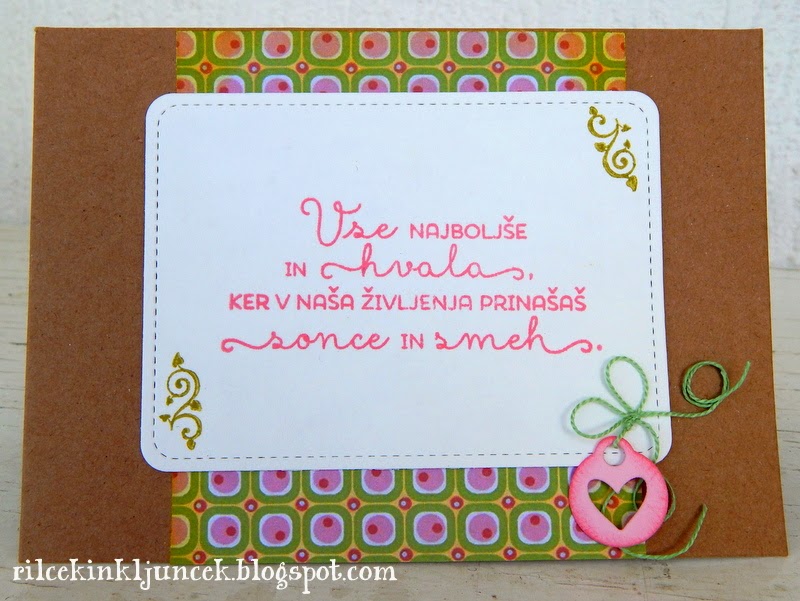 Za osnovo sem izbrala skico CAS(E) this Sketch. Na osnovo iz eko papirja sem nalepila pisan papir v lepih pomladnih barvah (papir je v bistvu reklama za blago). Napis je že sam dekorativen, zato sem mu dala osrednje mesto. Ker je bila šablona prevelika, sem na vogale odtisnila še dve drobni spirali, v en vogal pa sem zalepila mali izrez kartončka s srčkom. Vrvico sem premazala s Studio Matte, da sem dobila želeno obliko in tudi pentljo sem s tem prilepila na voščilnico.