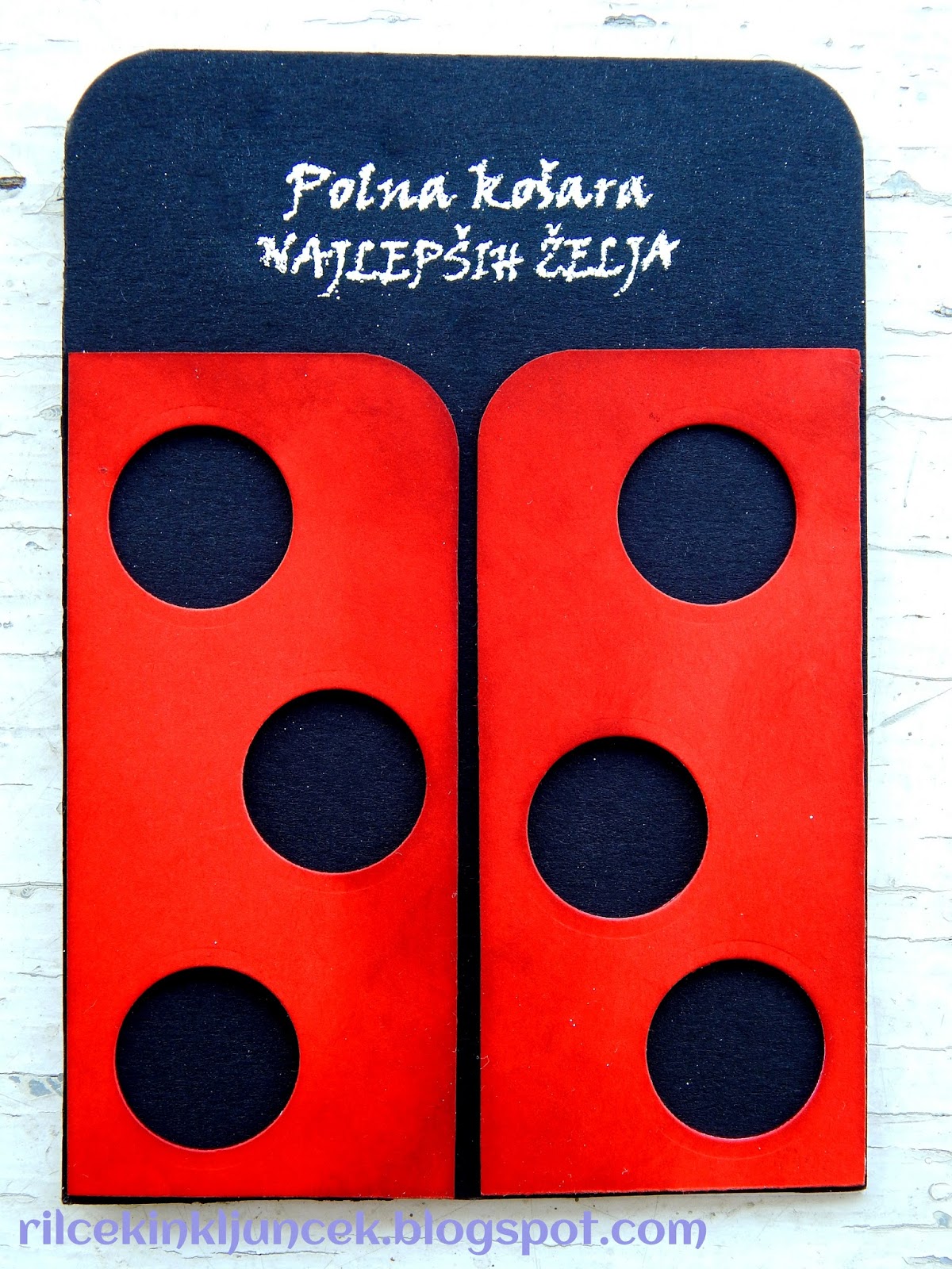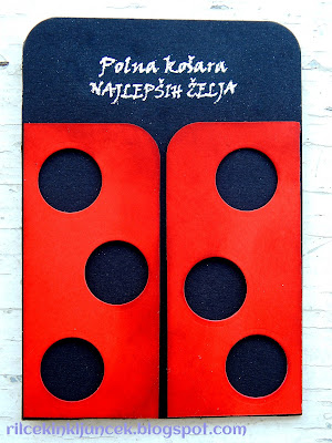 V bistvu je bila sama izdelava zelo preprosta: Najprej sem izrezala črno podlago v velikosti voščilnice, nato je prišel na vrsto moj Cuttlebug ... s šablono Lawn Fawn sem izrezala rdeč pravokotnik, ki sem ga posredi razpolovila; nato sem s Spellbinders šablonami izrezala kroge, da sem dobila pike. Pike sem naluknjala naključno ... v naravi ni simetrije. Na podlago sem rdeč karton zalepila z debelejšim 3D trakom. Tik pred lepljenjem sem z reliefnim prahom dodala še napis, voščilo.