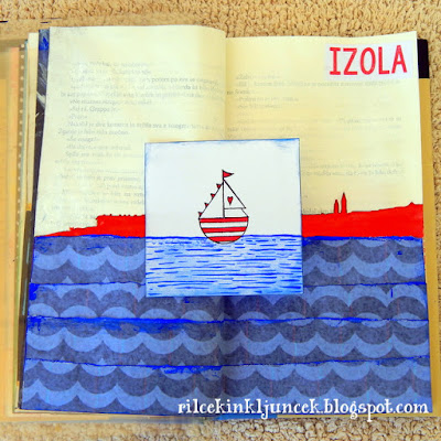 Najprej sem naredila silhueto Izole, ki pa sem jo v sredinskem delu malo razvlekla, saj bi sicer zvonika prišla za kartonček, nato sem začrtano s svinčnikom pobarvala z rdečim Izink tušem. Papir na valove sem najprej nameravala zalepiti v enem kosu, a je deloval preveč monotono, zato sem ga kar prostoročno raztrgala na trakove, vogale senčila z akrilno barvo ter zlepila skupaj.