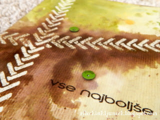 Najprej sem na kos risalnega lista poštempljala odtise pnevmatik, nato sem z eno izmed "packalnih" tehnik, t.i. smooshing, nanesla 3 barve Distress Inkov: Peeled Paint, Walnut Stain in Antique Linnen. Ko se je vse skupaj posušilo, sem natisnila še voščilo in dodala 3 luskice, na fotografiji zgornja luskica deluje veliko bolj rumeno kot je v resnici: v bistvu je nežno rumene barve in prosojna, tako da je komaj opazna.