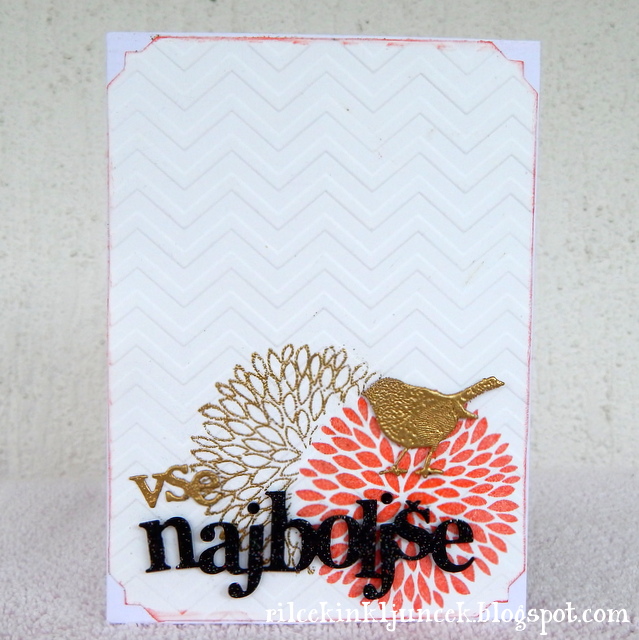 Najprej sem natisnila koralno rdečo rožo, ki sem jo še dodatno utrdila s prozornim reliefnim prahom. Nato sem ustvarila cik-cak vzorec ... v bistvu sem nameravala še prej odtisniti zlato rožo, a sem vmes dobila telefonski klic in sem vse skupaj malo pomešala. Sem že razmišljala, da zlate rožice sploh ne bi odtisnila, ker sem se bala, da odtis ne bo popoln zaradi neravne podlage. Sicer sem štampiljko kar močno pritisnila na podlago, vendar proti pričakovanjem sem dobila zelo dober odtis, ki sem ga posula z zlatim reliefnim prahom in pogrela. Ostalo mi je samo še, da dodam voščilo. Oba dela sem imela že izrezana. Črnega sem najprej prebarvala in nato dobro namočila v črnem reliefnem prahu z bleščicami. Nazadnje sem še dodala ptička, čeprav sem v prvotnem načrtu imela v mislih metuljčka. Zdelo se mi je, da se ptiček bolj opazi.