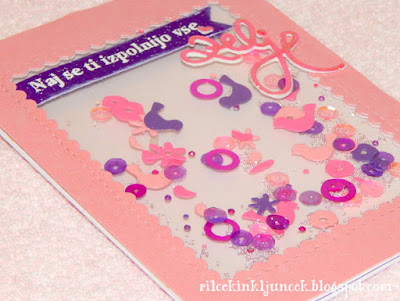 Naredila sem tresočkom s prozornim oknom. Na osnovo za voščilnico sem začasno zalepila rožnat list z bisernim leskom, pomerila in izrezala okno skozi oba lista. Nato sem pripravila dva kosa prozorne folije: prvega sem takoj prilepila na osnovo za voščilnico ter okence oblepila z navadnim obojestranskim lepilnim trakom. Previdno sem v okvir iz lepilnega traka položila različne izrezke v ustreznih barvah (Memory Box ptice in Najlepši par rožice), dodala sem še malo mikroperlic, kristalčkov in luskic. Lahko bi dodala še bleščice, a tokrat sem se odločila, da jih ne bom. Previdno sem odstranila zaščito z obojestranskega lepilnega traka ter prilepila čez eno plast prozorne folije še drugo. Nato sem natisnila še voščilo ter ga obdelala z belim reliefnim prahom, drugi del pa sem izrezala ter privzdignila s pomočjo moosgumija. Besedo želje sem še dodatno poudarila z bleščicami Wink of Stella.