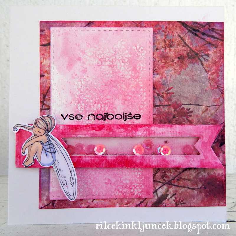Papir za podlago je digitalni, izbrala sem rože narisane na platno. Nato sem se lotila drugega kartončka: s šablono Najlepši par sem izrezala pravokotnik, na katerega sem odtisnila štampiljko z reliefnim prahom, nato vse skupaj prebarvala z Izink tušem in veliko vode ter senčila z Distress Inki. Nazadnje sem natisnila malo vilinko ter jo pobarvala s Copic markerji. Največ časa pa sem porabila za tresočko v obliki traka. Napolnila sem jo z luskicami in mikroperlami v rožnati barvi.