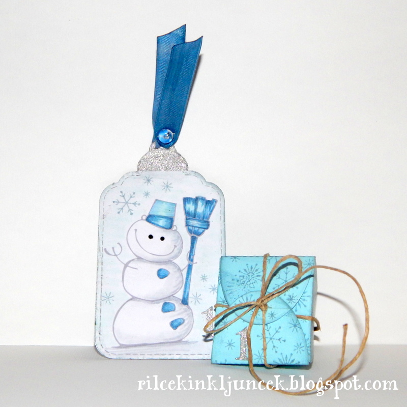 Na kos papirja sem natisnila snežaka, ga pobarvala in izrezala v obliki kartončka. Na vrh sem dodala bleščečo kapico in prav tako bleščečo številko 1, ostalo sem pobarvala s Copic markerji v sivo-modrih tonih. Okoli snežaka sem z Distress Inkom odtisnila nekaj štampiljk z drobnimi snežinkami. Podobno sem naredila s škatlico. Kartonček sem potiskala s štampiljkami za snežinke, vstavila sladko presenečenje in zavezala z vrvico. Vse robove sem senčila z Distress Inkom iste barve (Weathered Wood).